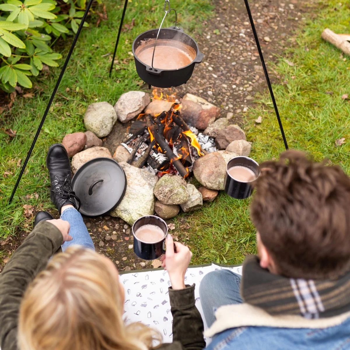 Stevige kampvuur driepoot met ketting. Te gebruiken in combinatie met een kampvuurpot of rond barbeque rooster (beide niet bijgeleverd boven een kampvuur. Snel en gemakkelijk zonder schroeven op te zetten of af te breken. Deze set wordt geleverd met kettingen en karabijnhaken, om op verschillende hoogtes te kunnen koken.