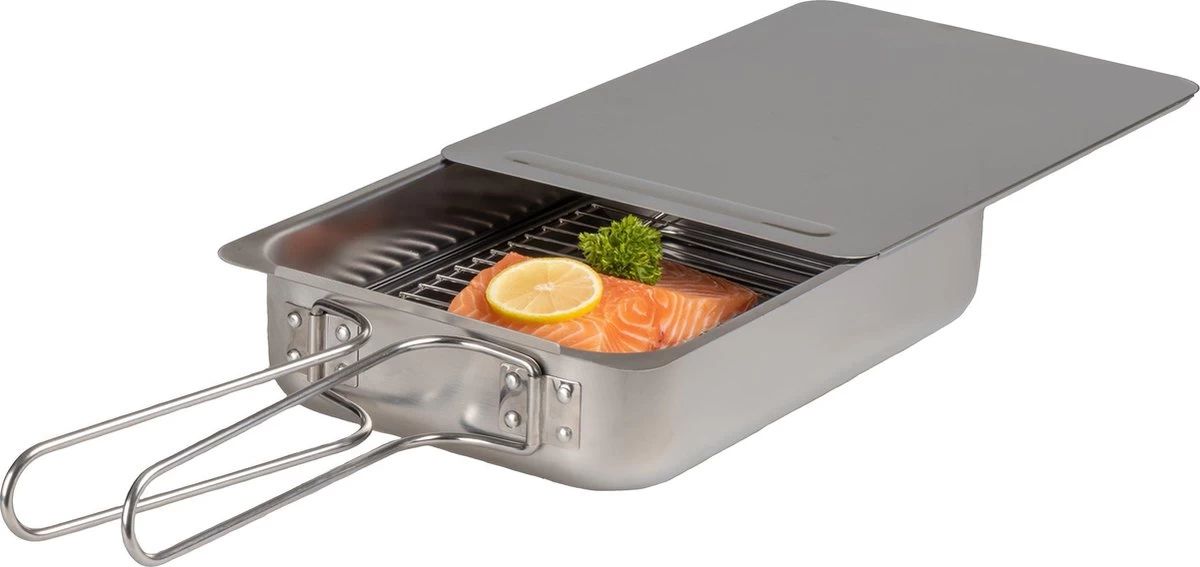 Met de rookoven van Jay Hill kun je makkelijk en snel een aromatische rooksmaak aan je vis, vlees of andere ingrediënten geven. Maak een heerlijke zalm met een stoere saus door verschillende soorten rookmot te gebruiken. De Jay Hill rookoven wordt standaard geleverd met een lekschaal, rooster en een deksel. Hij is geschikt voor gas- en elektrische kookplaat, oven, grill en op de barbecue. Het leuke van de rookoven is dat je deze ook kunt gebruiken als gewone oven, braadslede en stomer. Jay Hill Rookoven gebruikenWanneer je de rookoven wilt gebruiken leg je rookmot onder de lekschaal, vervolgens zet je de rookoven op of in de gewenste warmtebron. De warmte van de oven, barbecue of andere warmtebron zorgt ervoor dat er rookontwikkeling tot stand komt. Bij gebruik is het belangrijk dat het deksel altijd goed gesloten is. Was de rookoven na gebruik met de hand af.