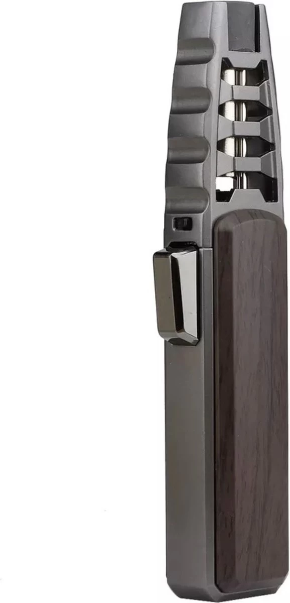 Merkloos Turbo Jetflame Aansteker – Gasbrander – Vuurwerk Torch – Crème Brûlée Brander – BBQ En Sigaren Aansteker – Windproof – Walnoothout Met Grijze Metalen Behuizing